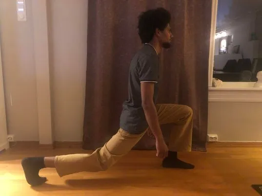 The Asian squat can stretch out your lower back, quads, and hamstrings at the same time. You need to squat down to your feet while you're hamstrings touch your calves. If you can't squat down, go as far as possible, you will be able to go further over time. Do this exercise 4 times and hold it for a few seconds. Remember to keep your feet flat with your knees bent.